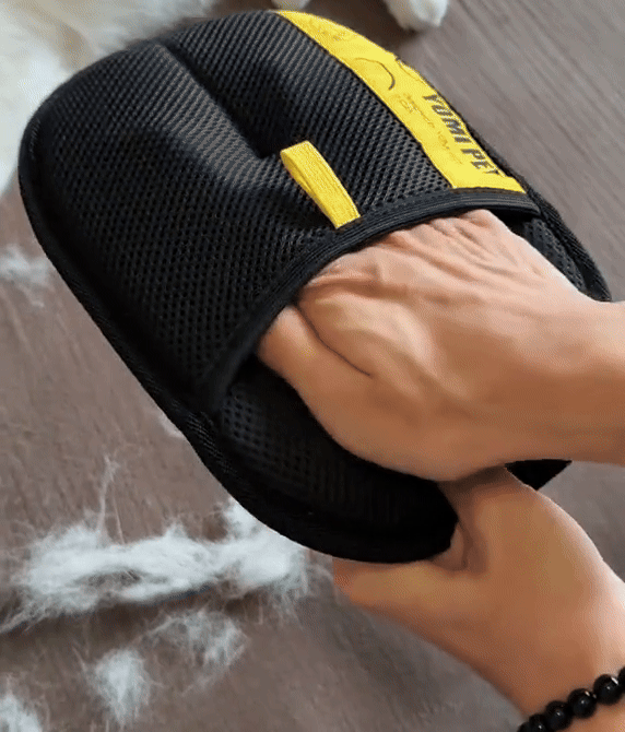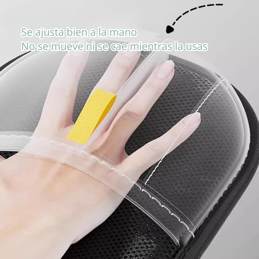 Gracias a la fricción de su tejido, el pelo se desprende de la superficie y queda atrapado en la manopla, y después se retira fácilmente para volver a usarla.